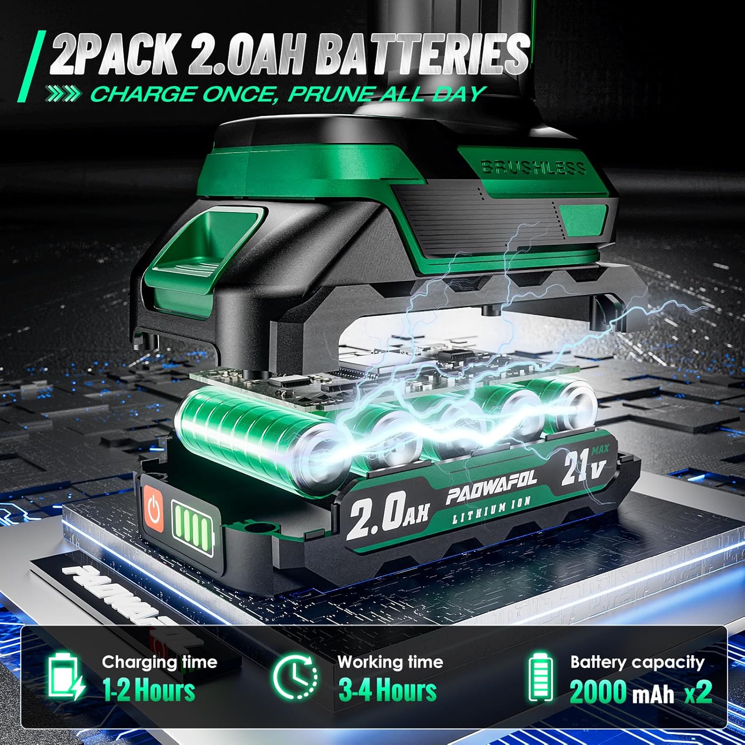 - 【BRUSHLESS MOTOR SAVES TIME & EFFORT】what great power and efficiency! The PAOWAFOL electric pruner is cordless and equipped with a powerful 1000W brushless motor, making it easy to complete various garden cutting tasks! Compared to regular brushed motors, this upgraded brushless motor of pruning shears has increased efficiency by 300%!
