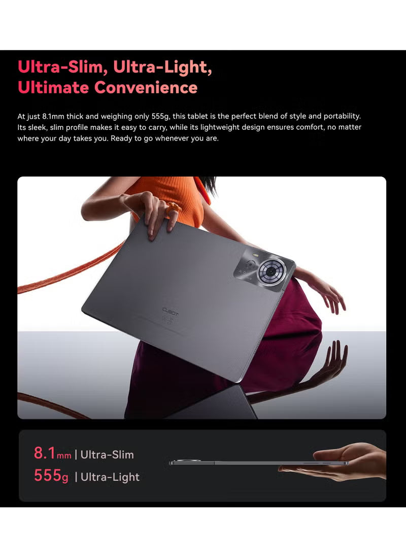 Meet the CUBOT TAB 70 – where sleek design meets powerhouse performance! At just 8.1mm ultra-slim, this Wi-Fi tablet slips effortlessly into your lifestyle, blending portability with premium style. Running Android 14 and boasting 16GB (6+10) RAM, it’s a multitasking marvel, handling work, streaming, and gaming without a hiccup. Store all your apps, photos, and files in its 128GB ROM, expandable for endless possibilities. The vibrant 10.95’’ HD+ touchscreen delivers crystal-clear visuals, making every swipe, scroll, and click a joy. Perfect for on-the-go pros and entertainment lovers, this tablet is your ultimate companion for speed, style, and seamless performance.
